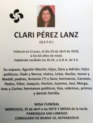 Ayer por la tarde, falleció en Astrabudua, donde resídia la desojana, Clari Pèrez Lanz. Tenía 62 años. Muy joven para morir.